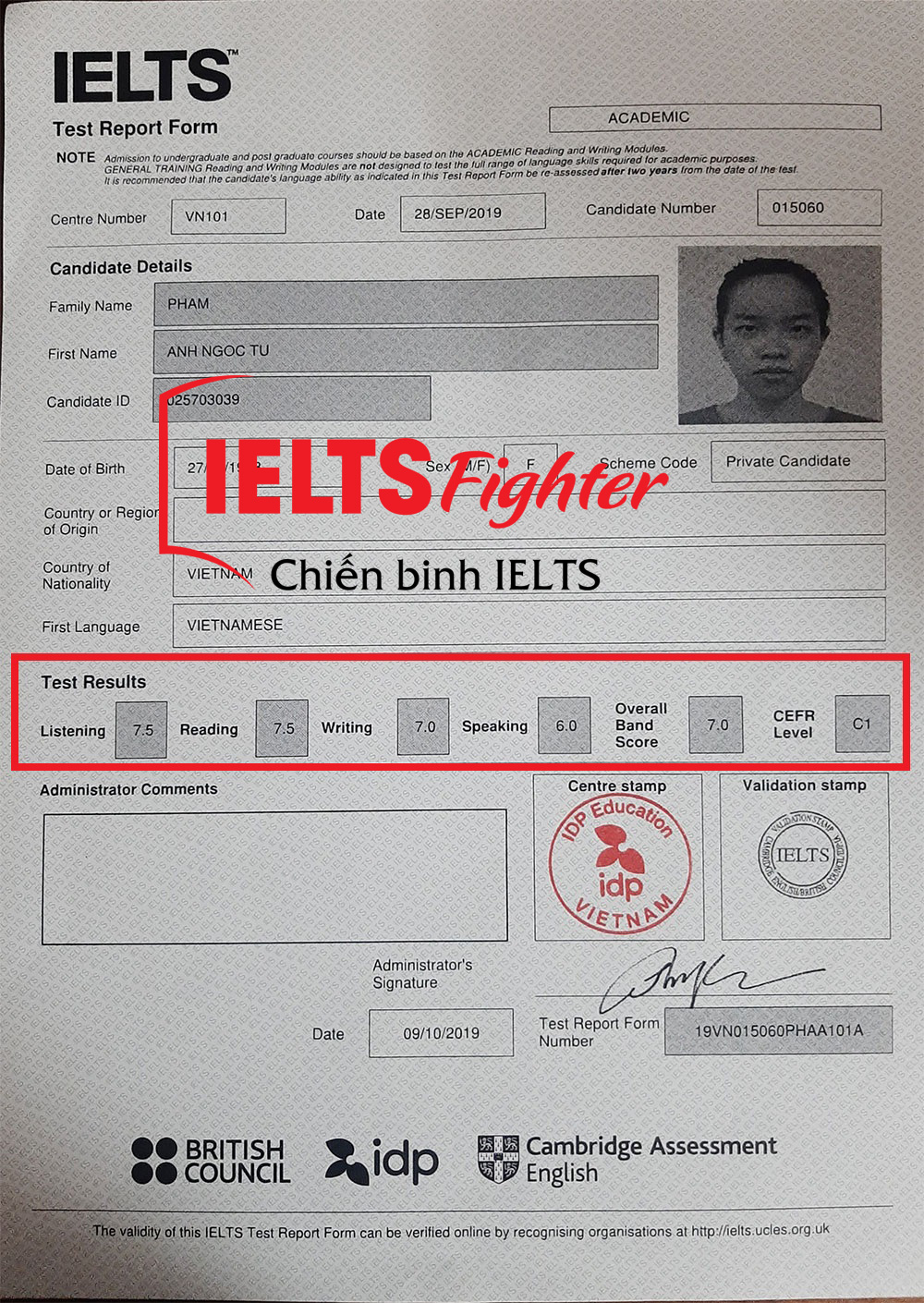 Kết quả này không quá cao nhưng với 2 tháng học và 2 tháng tự ôn luyện mình nghĩ nó cũng là một kinh nghiệm đáng nhớ trong đời. Mình đã từng học qua IELTS trong một vài vài học phần trong chương trình học ở trường đại học do đó cũng không quá khó khăn khi luyện thi, tuy nhiên các bạn biết đấy, việc nâng band điểm khá là khó khi ở mức >6.0 IELTS vì thế nếu tự học một mình rất khó nâng band. Vì thế mình đã tìm hiểu 1 vài trung tâm luyện thi IELTS uy tín và thật may mình tìm thấy chân ái của cuộc đời – IELTS Fighter.