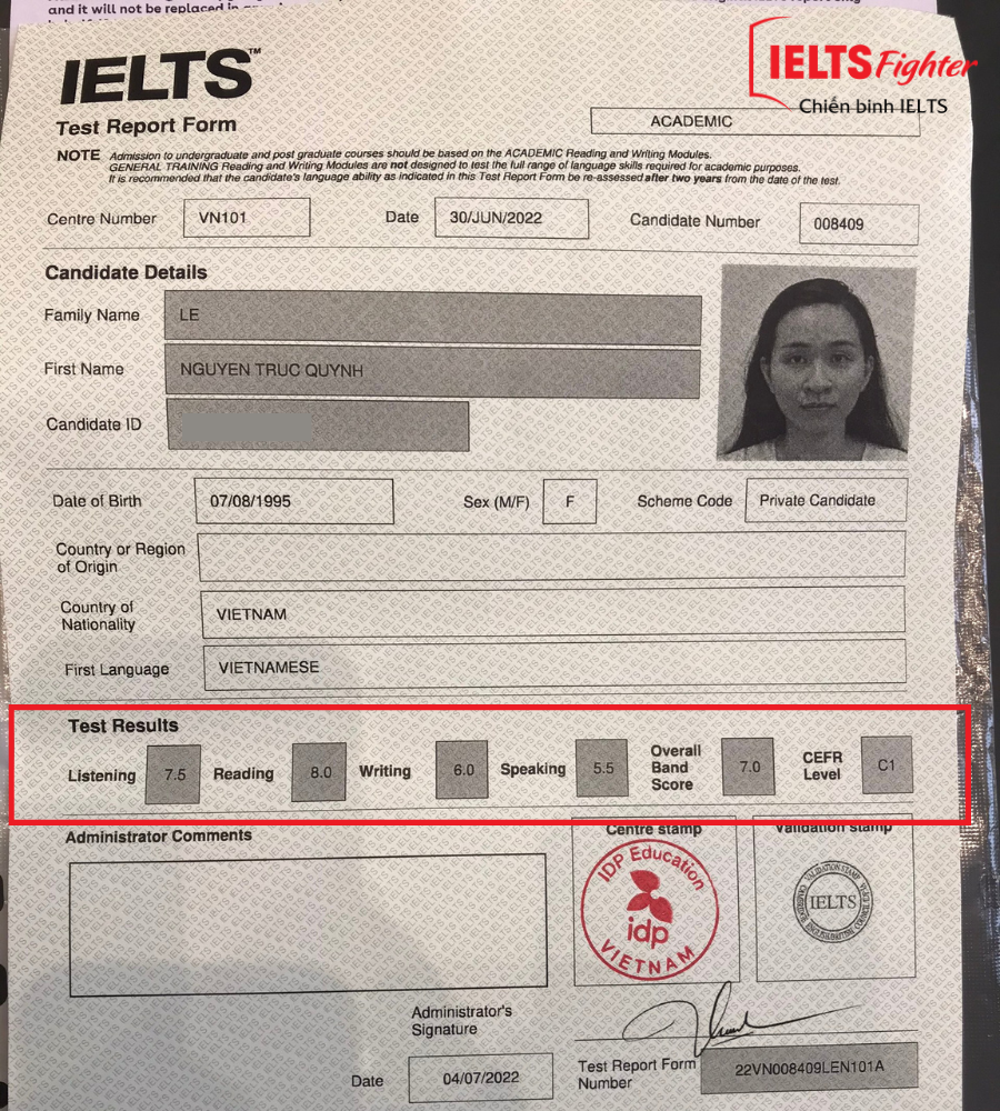 Thực sự mình không dám chia sẻ nhiều vì thực tế mình chỉ nghe trên một số bản tin thời sự tiếng Anh và Vlog trên Youtube, ít luyện Cam. Luyện Reading trên các Actual Tests mà giáo viên cung cấp. Mình thi dạng Computer-based tại IDP Mạc Đĩnh Chi. Cơ sở vật chất và các bạn staff thân thiện khỏi phải bàn.