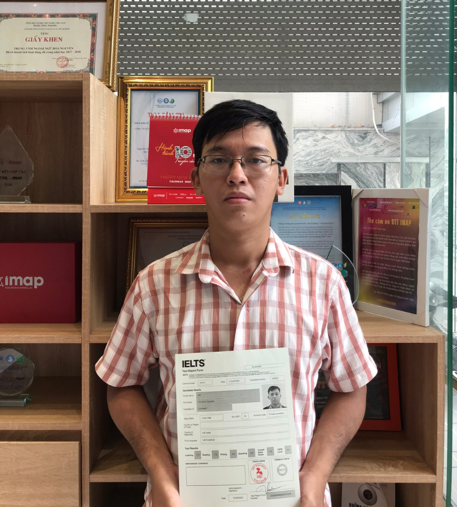| Vinh danh học viên: ✪ Họ tên: Mô Võ Nhựt Quang ✪ Overall: 7.0 IELTS ✪ Read-7.5, Lis-7.5, Wri-6.0, Speak-6.0 ✪ Học viên lớp: B22748 |