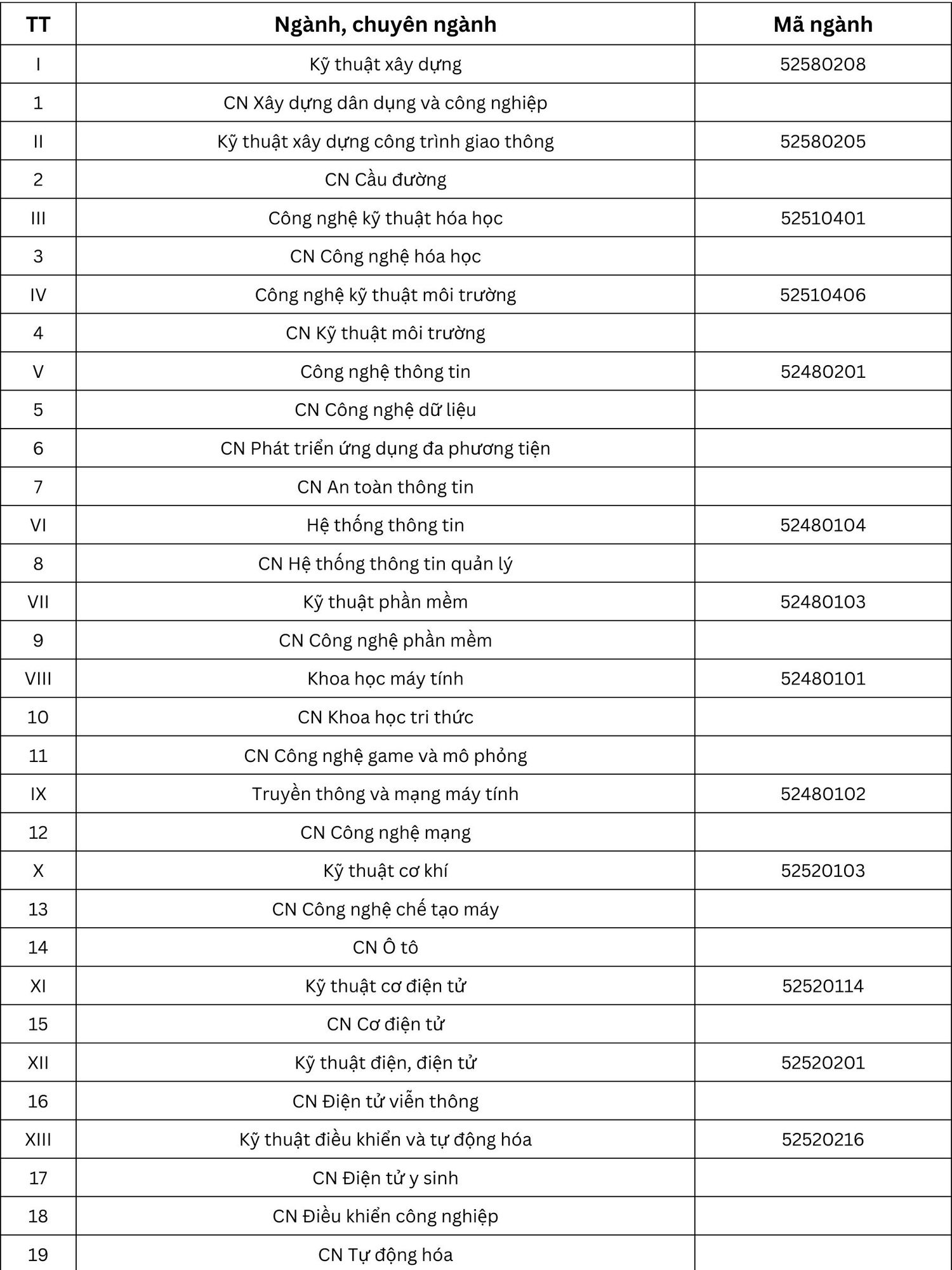 | 10 | Cơ học kỹ thuật | 62 52 02 01 |
