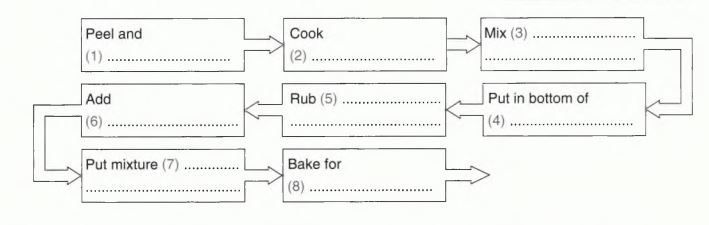 | 7 | on top (of fruit) | When it’s ready, put the crumble mixture on the top of the fruit | Câu hỏi đã có đầy đủ động từ và danh từ (‘put mixture’) nên ta cần điền thêm bổ ngữ |
