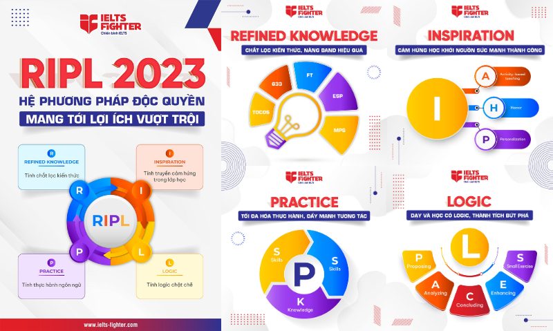 RIPL là phương pháp đào tạo toàn diện, độc quyền được nghiên cứu, thử nghiệm và sáng tạo bởi chính đội ngũ chuyên gia học thuật cấp cao tại IELTS Fighter. Phương pháp đào tạo RIPL lấy người học làm trung tâm, cùng khám phá và và kiến tạo nội dung bài học, giúp việc học ngoại ngữ nói chung và IELTS nói riêng đạt được hiệu quả cao trong thời gian ngắn.