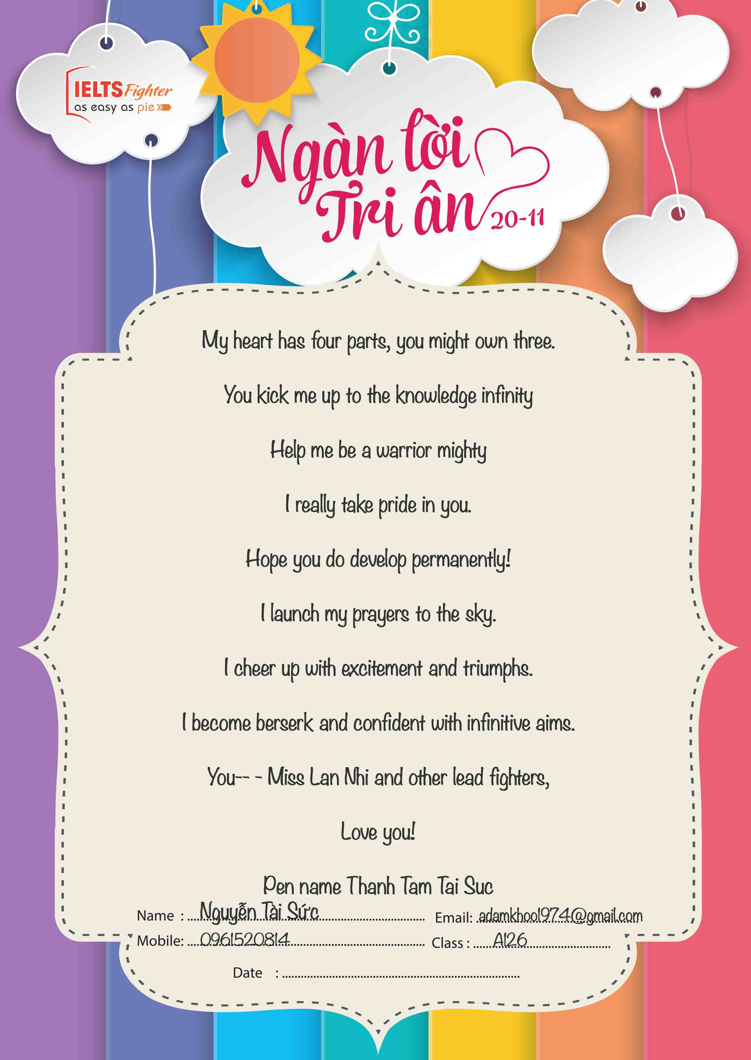 Chi tiết thể lệ và giải thưởng xem tại: https://ielts-fighter.com/tin-tuc/Cuoc-thi-34-Ngan-loi-tri-an-2017-34-Chao-mung-ngay-Nha-giao-Viet-Nam-20-11_mt1509461191.html
