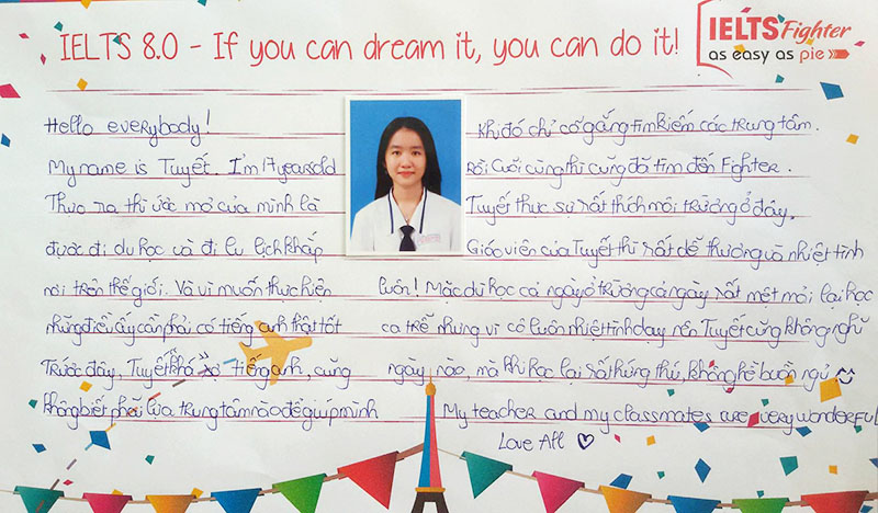 My name is Tuyết. I'm 17 years old. Thực ra thì ước mơ của mình là được đi du học và đi du lịch khắp nơi trên thế giới. Và vì muốn thực hiện những điều ấy cần phải co tiếng Anh thật tốt. Trước đây, Tuyết "khá" sợ tiếng Anh, cũng không biết phải lựa chọn trung tâm nào để giúp mình. Khi đó chỉ cố gắng tìm kiếm các trung tâm. Rồi cuối cùng thì cũng đã tìm đến Fighter. Tuyết thực sự rất thích môi trường ở đây. Giáo viên của Tuyết thì rất dễ thương và nhiệt tình luôn! Mặc dù học cả ngày ở trường cả ngày rất mệt mỏi, lại học ca trễ nhưng vì cô luôn nhiệt tình dạy nên Tuyết cũng không nghỉ ngày nào, mà khi học lại rất hứng thú, không hề buồn ngủ ^.^
