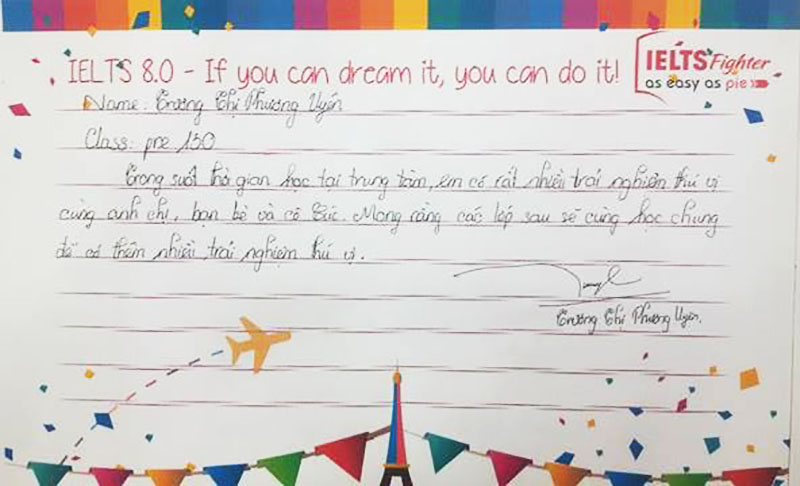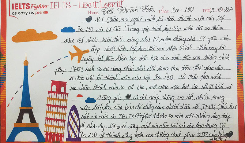 Hi! Chào mọi người, mình là Hòa, thành viên của lớp Pre130 của cô Cúc. Trong quá trình học tập mình đã có thêm được rất nhiều kiến thức cũng như kỷ niệm đáng nhớ. Cô giáo xinh đẹp, nhiệt tình, lớp học thì vui nhộn bổ ích. Hôm nay là ngày kết thúc khóa học đầu tiên của mình trên con đường chinh phục IELTS, mình có vài dòng nhắn nhủ đến trung tâm, toàn thể giáo viên và đặc biệt là thành viên của lớp Pre130. Lời đầu tiên mình xin chân thành cảm ơn cô Cúc, một giáo viên hết sức nhiệt tình và đáng yêu <3 Cô đã giúp chúng em rất nhiều trong việc lấy lại căn bản để dũng cảm chiến đấu với IELTS. Thứ 2 mình xin cảm ơn IELTS Fighter đã tạo ra một môi trường học tập tốt như vậy. Lời cuối cùng mình xin chúc tất cả các bạn trong lớp Pre130 sẽ thành công trên con đường chinh phục IELTS của bản thân!