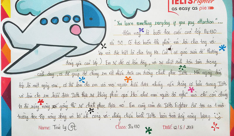 Hôm nay là buổi học cuối của lớp Pre130 rồi. Có hơi buồn khi phải nói lời chia tay với lớp và đặc biệt là chia tay Ms Cúc <3 (cô giáo siêu dễ thương, đáng yêu của lớp). Em sẽ nhớ cô lắm đây, với sự nhiệt tình, tận tâm trong cách dạy, cô đã giúp đỡ chúng em rất nhiều trên con đường chinh phục IELTS. Mỗi ngày đến lớp là một ngày vui, cô đã làm cho em và mọi người hiểu được những nền tảng cơ bản trong IELTS. Và làm cho em hiểu được IELTS thực sự không phải quá khó như mọi người đã nghĩ mà chỉ cần chúng ta ddue siêng năng, cố gắng thì sẽ chinh phục được nó. Em cũng cảm ơn IELTS Fighter đã tạo ra một môi trường học tập năng động và bổ ích cùng với những chiến binh IELTS luôn tràn đầy năng lượng.