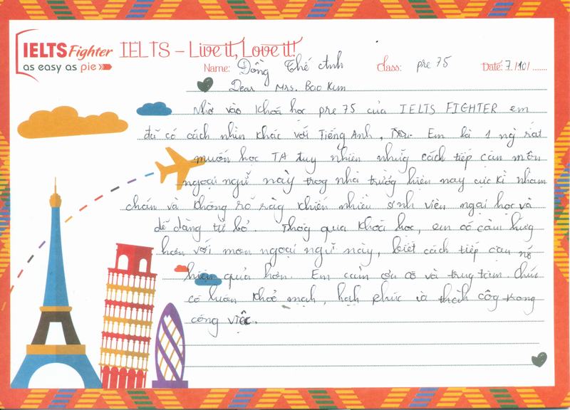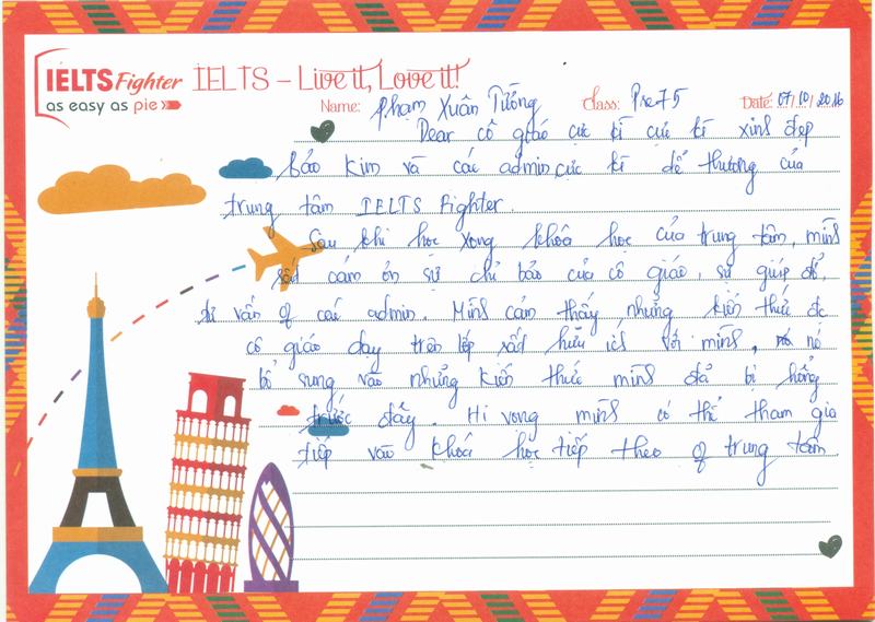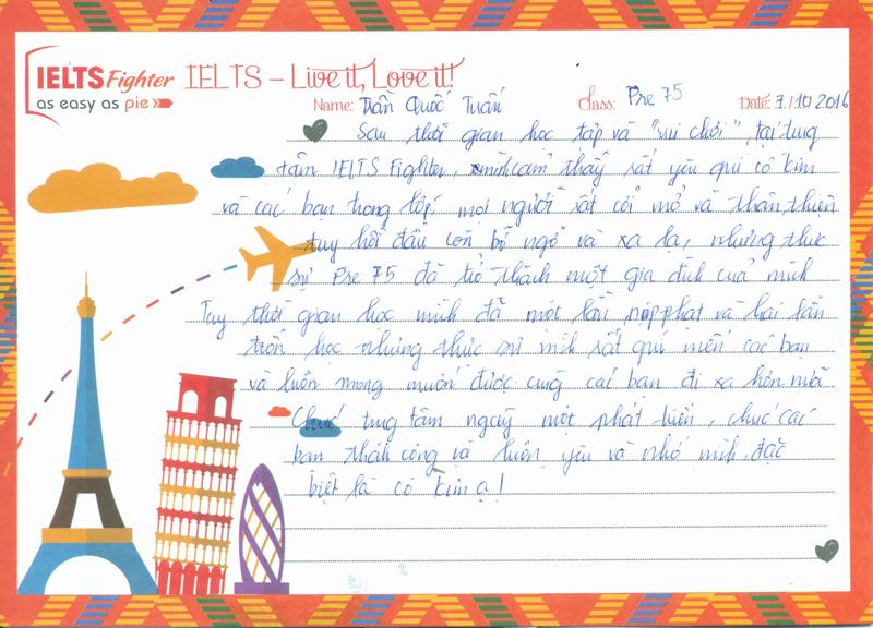 Sau thời gian học tập và "vui chơi" tại trung tâm IELTS Fighter, mình cảm thấy rất yêu quý cô Kim và các bạn trong lớp, mọi người rất cởi mở và thân thiện. Tuy hồi đầu còn bỡ ngỡ và xa lạ, nhưng thực sự Pre75 đã trở thành một gia đình của mình. Tuy thời gian học mình đã một lần nộp hạt và 2 lần trốn học nhưng thực sự mình rất quý mến các bạn và luôn mong muốn được cùng các bạn đi xa hơn nữa.