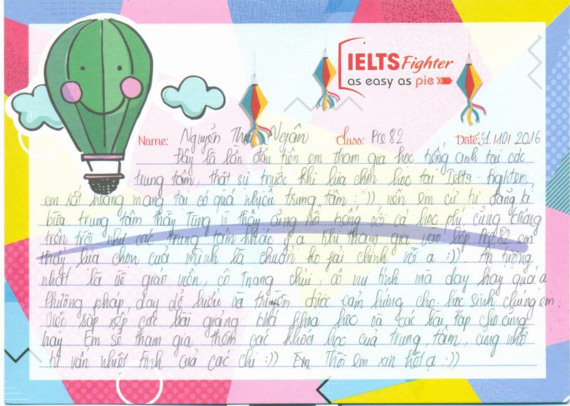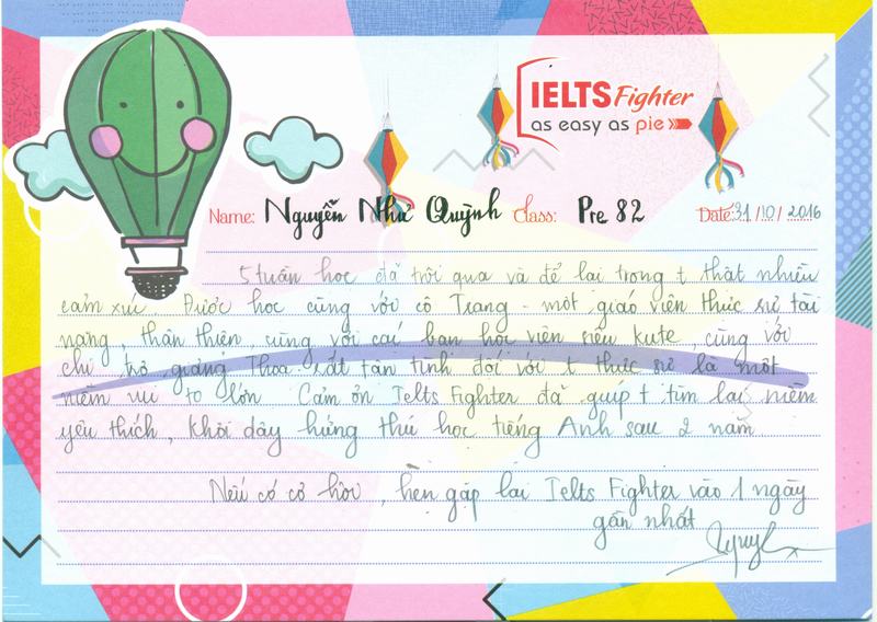 - Trong vòng hơn 1 tháng được tham gia học tại IELTS Fighter cùng với cô Trang chuối em cảm thấy rất thú vị và em cũng đã có những giờ học vui vẻ và bổ ích. Rất tiêc khi phải chia tau lớp khá sớm, mong sẽ được có cơ hội học tiếp với trung tâm.