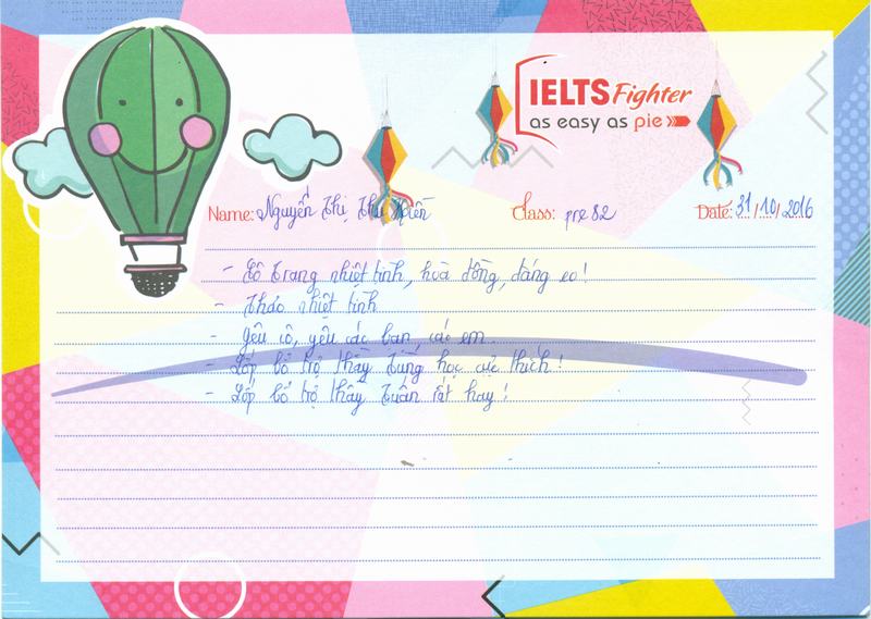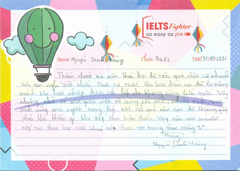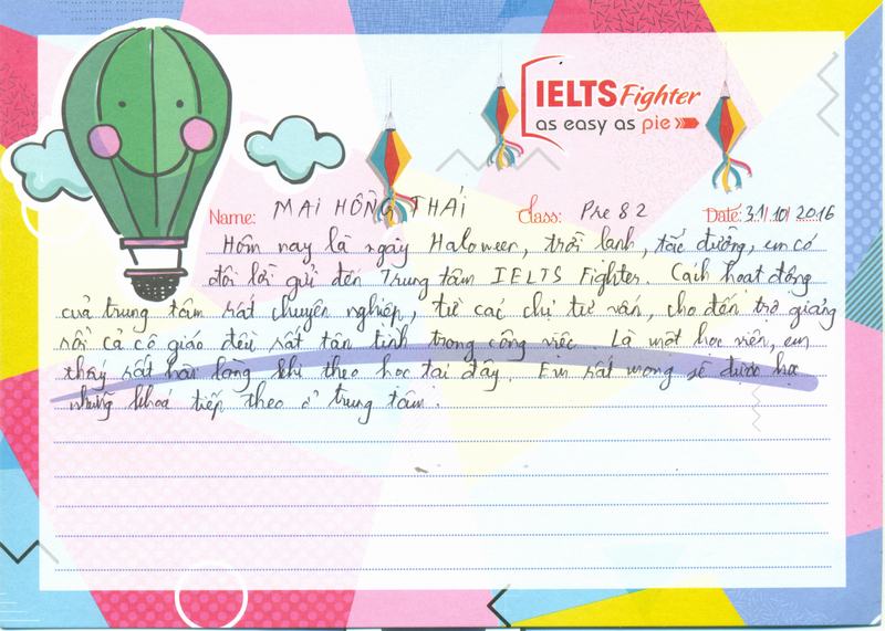 Hôm nay là ngày Haloween, trời lạnh, tắc đường, em có đôi lời gửi đến trung tâm IELTS Fighter. Cách hoạt động của trung tâm rất chuyên nghiệp, từ các chị tư vấn, cho đến trợ giảng, rồi cả cô giáo đều rất tận tình trong công việc. là một học viên, em thấy rất hài lòng khi theo học tại đây. Em rất mong sẽ được học những khóa tiếp theo tại trung tâm.