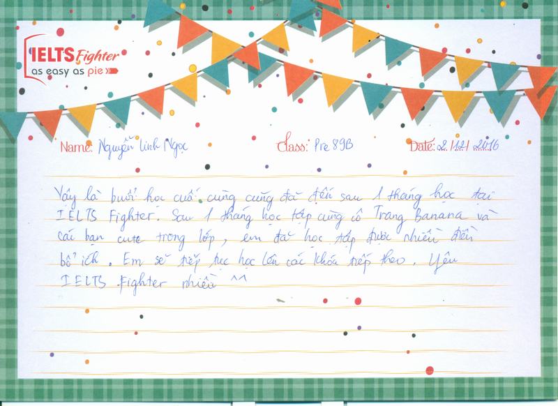 Vậy là buổi học cuối cùng cũng đã đến sau 1 tháng học tại IELTS Fighter. Sau 1 tháng học tập cùng cô Trang Banana và các bạn cute trong lớp, em đã học tập được nhiều điều bổ ích. Em sẽ tiếp tục học lên các khóa tiếp theo.