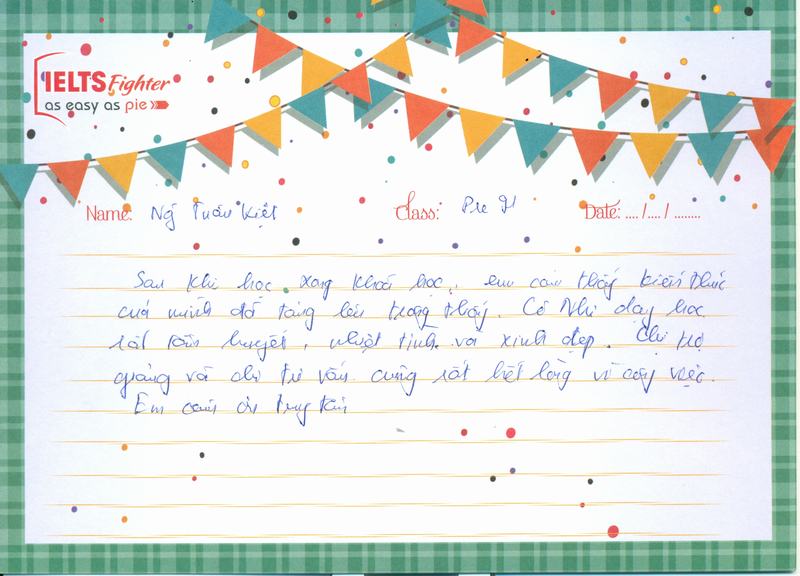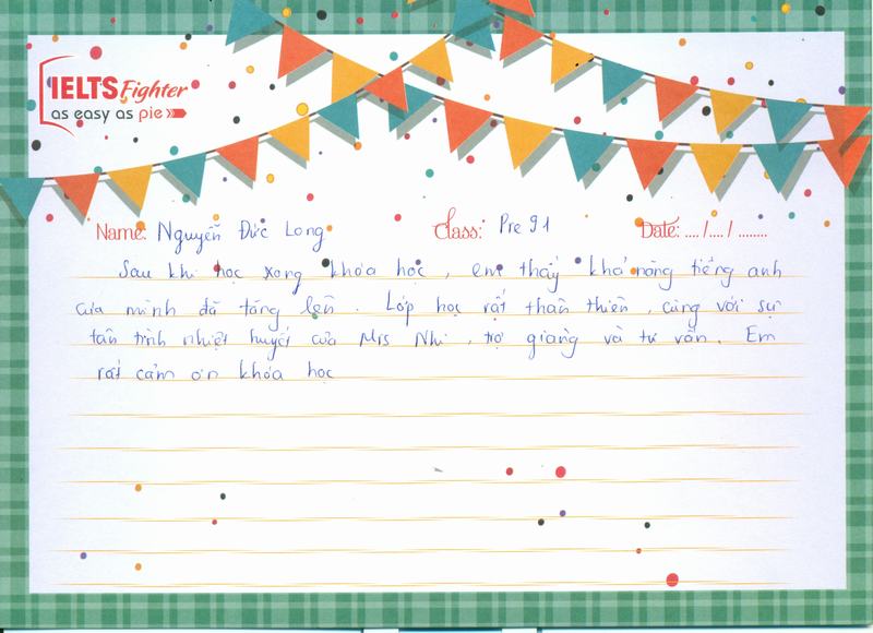 Sau khi học xong khóa học, em thấy khả năng tiếng Anh của mình đã tăng lên. Lớp học rất thân thiện, cùng với sự tận tình nhiệt huyết của Ms Nhi, trợ giảng và tư vấn. Em rất cảm ơn khóa học.