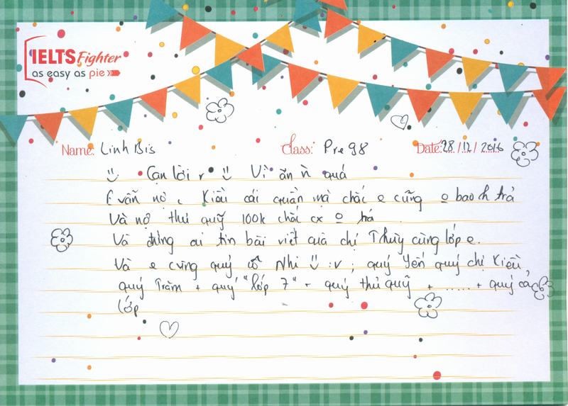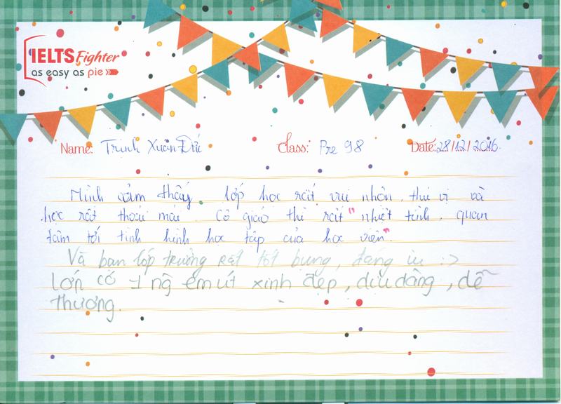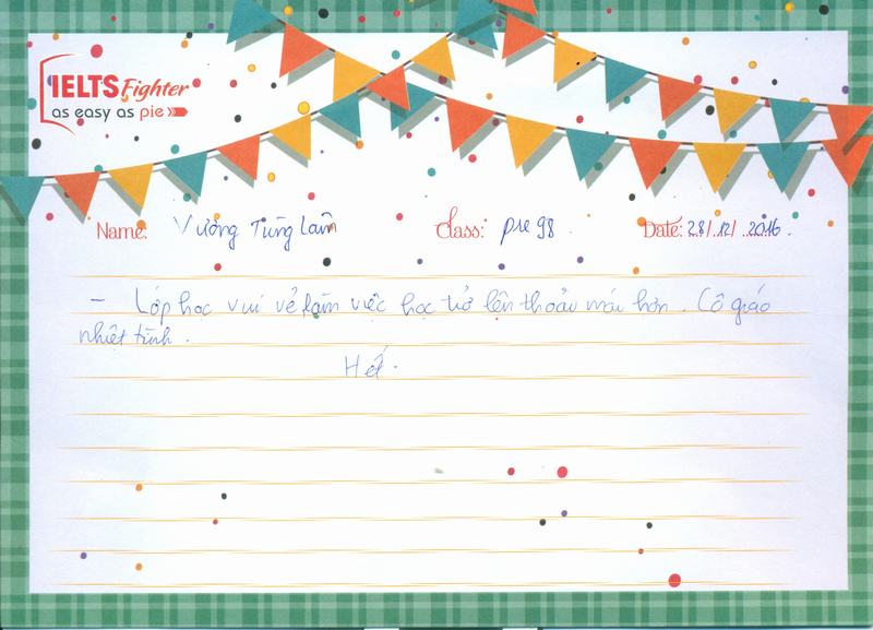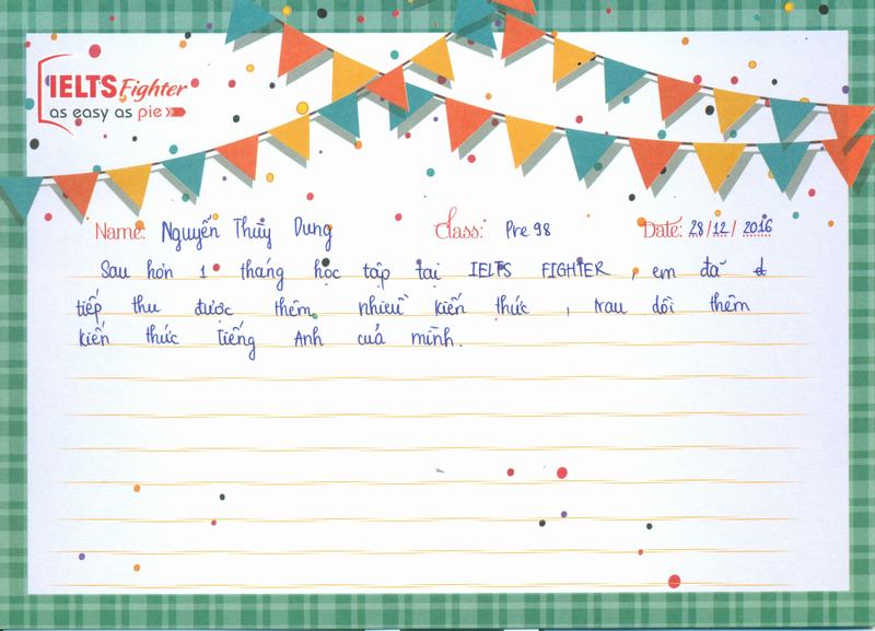 Sau hơn 1 tháng học tập tại IELTS Fighter, em đã tiếp thu được thêm nhiều kiến thức, trau dồi thêm kiến thức Tiếng Anh của mình.