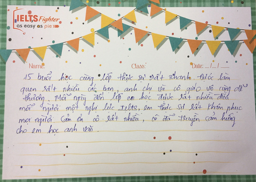 15 buổi học cùng lớp thực sự rất nhanh. Được làm quen rất nhiều các bạn, anh chị và cô giáo vô cùng dễ thương. Mỗi ngày đến lớp em học được rất nhiều điều, mỗi người một nghị lực IELTS, em thực sự rất khâm phục mọi người. Cảm ơn cô rất nhiều, cô đã truyền cảm hứng cho em học anh văn!
