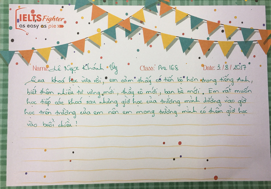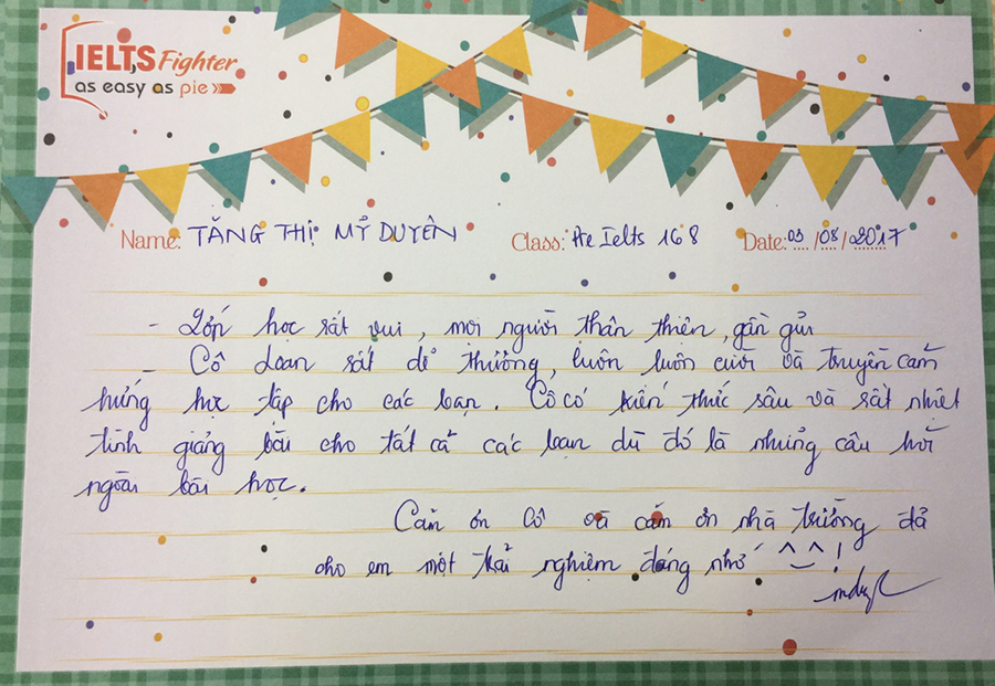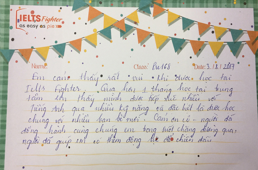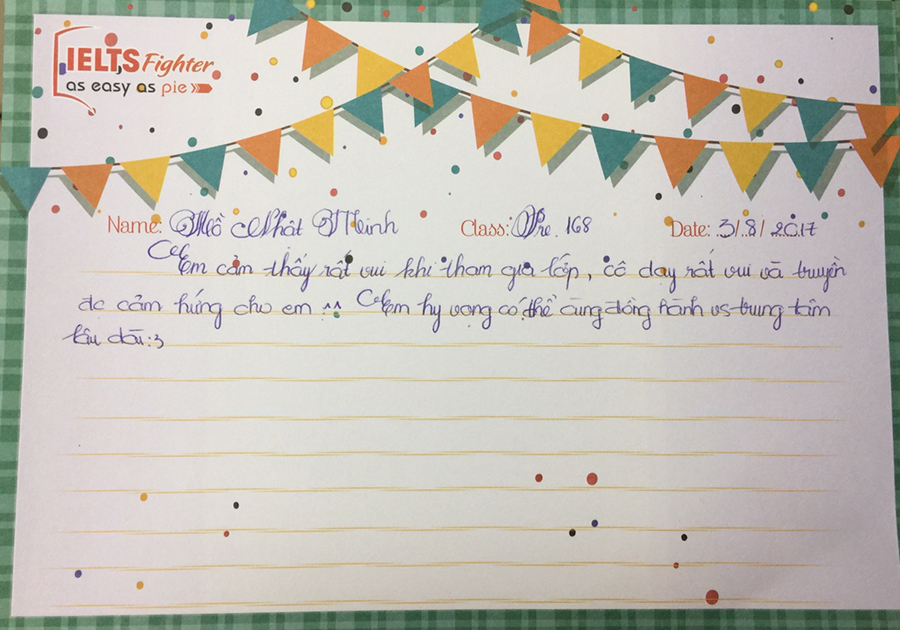 Em cảm thấy rất vui khi được học tại IELTS Fighter. Qua hơn 1 tháng học tại trung tâm em thấy mình được tiếp xúc với tiếng Anh qua nhiều kỹ năng và đặc biệt là được học chung với nhiều bạn bè mới.