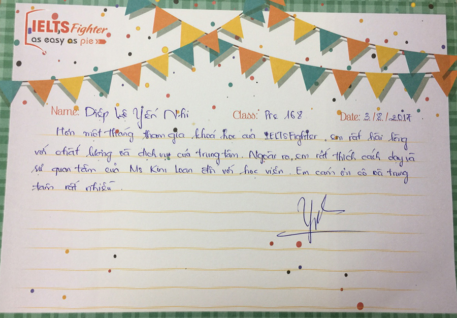 Diệp Lệ Yến Nhi: Hơn một tháng tham gia khóa học của IELTS Fighter, em rất hài long với chất lượng và dịch vụ của Trung tâm. Ngoài ra em rất thích cách dạy và sự quan tâm của Ms Loan đối với học viên! Em cám ơn cô và trung tâm rất nhiều!”