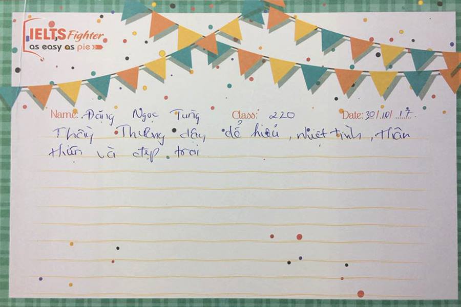 Em cảm thấy bản thân đã tiến bộ rất nhiều về trình độ tiếng Anh của mình, em xin chân thành cảm ơn thầy Thương đã giúp em tự tin hơn rất nhiều khi nói tiếng Anh. Thầy luôn tạo không khí thoải mái, vui vẻ trong lớp học.