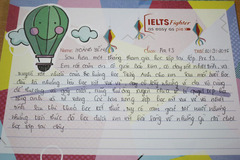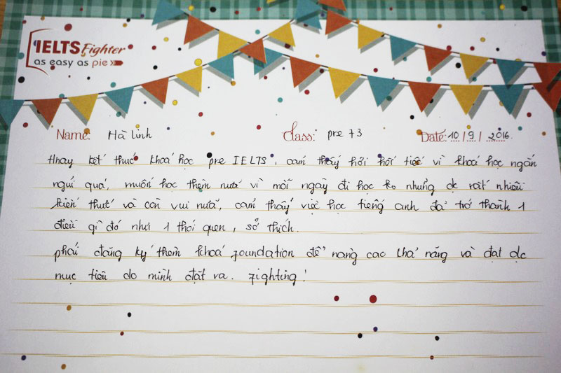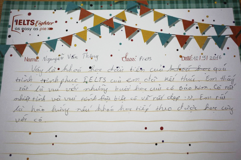Cảm ơn trung tâm IELTS Fighter và cô Bảo Kim đã giúp em lấy lại vốn tiếng Anh cơ bản để có thể học tiếp các khóa học trên. Em sẽ ủng hộ và tiếp tục đồng hành cùng với trung tâm trong những khóa học sắp tới.