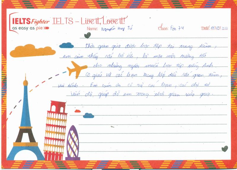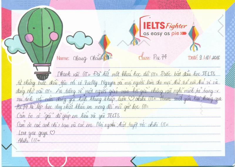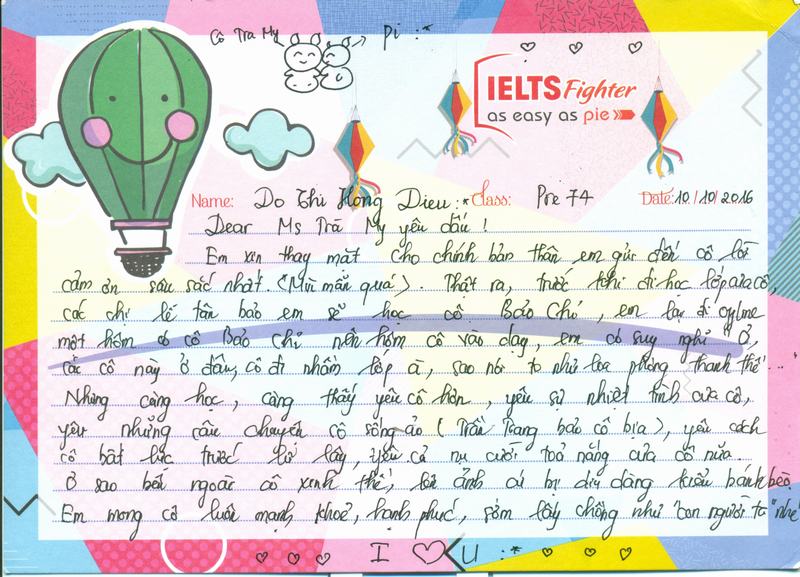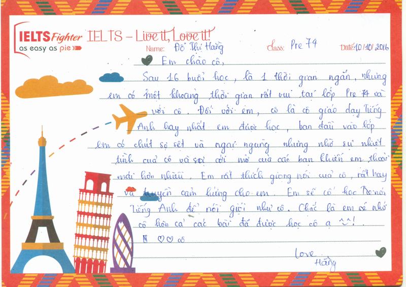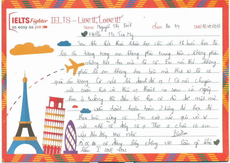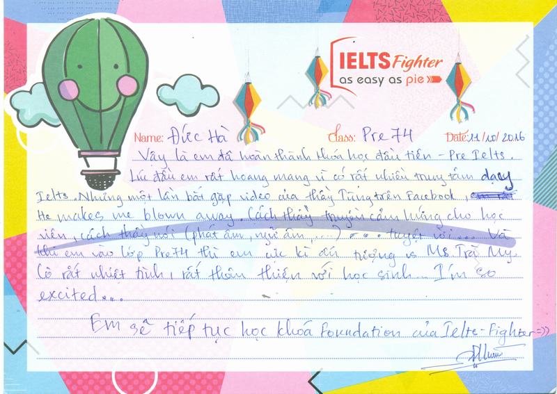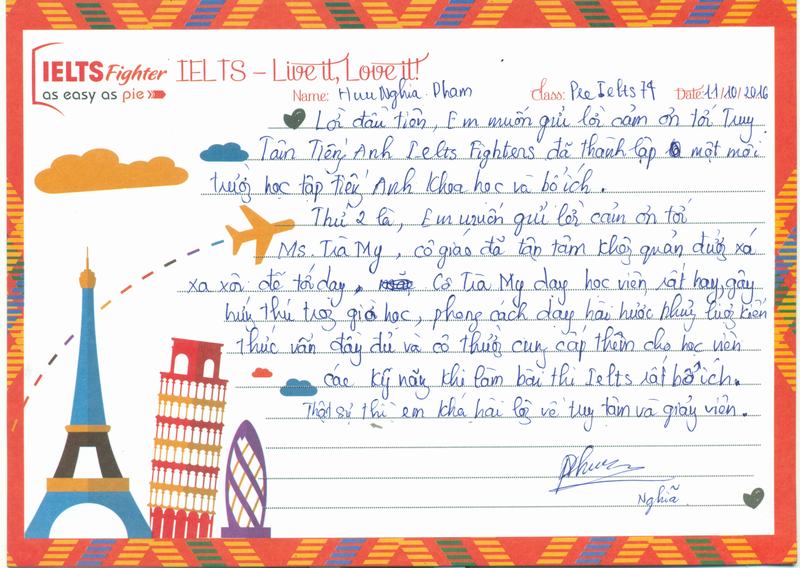 Lời đầu tiên, Em muốn gửi lời cảm ơn tới trung tâm tiếng Anh IELTS Fighter đã thành lập một môi trường học tập tiếng Anh khoa học và bổ ích.