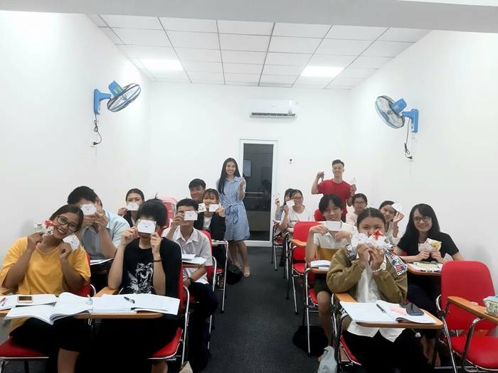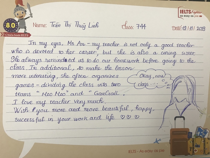 Bạn Trúc chia sẻ: "Cảm nhận đầu tiên về trung tâm IELTS Fighter là các chị tư vấn rất dễ thương, nhiệt tình và thân thiên. Đặc biệt là chị Thùy Dung rất xinh, tư vấn hết sức nhiệt tình.Khi đi học buổi đầu tiên, phải leo bộ 5 tầng lầu làm em rất mệt nhưng bù lại được gặp cô An rất xinh đẹp, dễ thương. Cô giảng bài dễ hiểu, em tiếp thu được khá nhiều kiến thức khi học tại lớp. Ngoài ra, lớp còn có các bạn rất trẻ trung, nhộn nhịp. Thêm nữa vừa học vừa chơi những trò chơi của cô An bày ra rất là vui. Và kẹo của trung tâm rất là delicious, đã cứu mỗi lúc em đói và mệt khi leo 5 tầng lầu. Hi vọng khóa sau trung tâm cho em học tầng thấp thấp thôi nha,cao quá em mệt!!! Nếu được trung tâm bắc thang máy luôn thì càng tốt ạ. :) Và khóa sau em mong cô An tiếp tục dạy em, cô không dạy chắc em nhớ cô lắm!!! Love you 3000!!! "