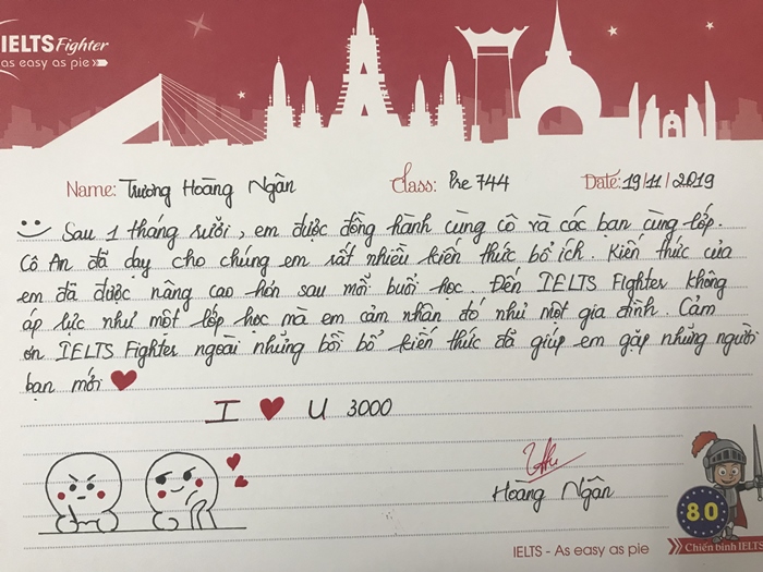 Bạn Trương Hoàng Ngân chia sẻ: " Sau một tháng rưỡi, em được đồng hành cùng cô và các bạn cùng lớp. Cô An đã dạy cho chúng em rất nhiều kiến thức bổ ích. Kiến thức của em đã được nâng cao hơn sau mỗi buổi học. Đến IELTS Fighter không áp lực như một lớp học mà em cảm nhận đó là một gia đình. Cảm ơn IELTS FIGHTER ngoài những bồi bổ kiến thức đã giúp em gặp những người bạn mới <3 "