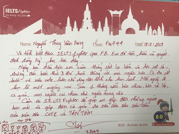 Bạn Xuân Dung chia sẻ: "Vô tình được biết IELTS Fighter qua FB. Em đã tìm hiểu và quyết định đăng ký học tại đây. Ngày học đầu tiên em cảm thấy rất lạ lẫm và hơi rụt rè, nhưng đến buổi thứ 3 thì hào đồng với mọi nguời hơn. Cô An rất hiền và siêu cute, luôn chỉ dạy tận tình cho học sinh. Mỗi ngày đi học là một ngày vui. Sau 1 tháng rưỡi bên nhau, bên cả lớp, cô gáo, mọi người coi nhau như người trong nhà.Cảm ơn IELTS Fighter đa giúp em gặp được những người bạn mới và gặp được cô giáo An siêu siêu siêu siêu siêu siêu siêu CUTE và TẬN TÌNH."