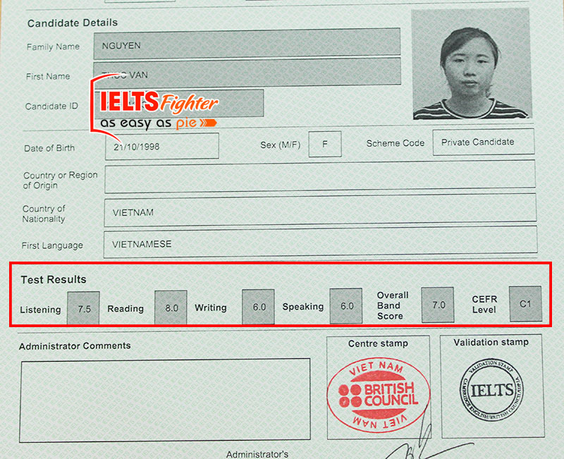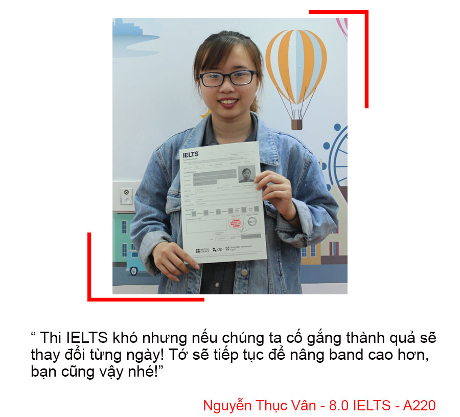 Khi đi học tại trung tâm, mình được thầy hướng dẫn học tỉ mỉ theo từng dạng bài, nắm chắc ngữ pháp, từ vựng sau đó dần cải thiện band điểm. Lớp học ở trung tâm rất vui nên mình cảm thấy có động lực học mỗi ngày. Mình cảm ơn thầy, các bạn lớp A220, các chị tư vấn viên và IELTS Fighter đã giúp mình đạt được kết quả này.