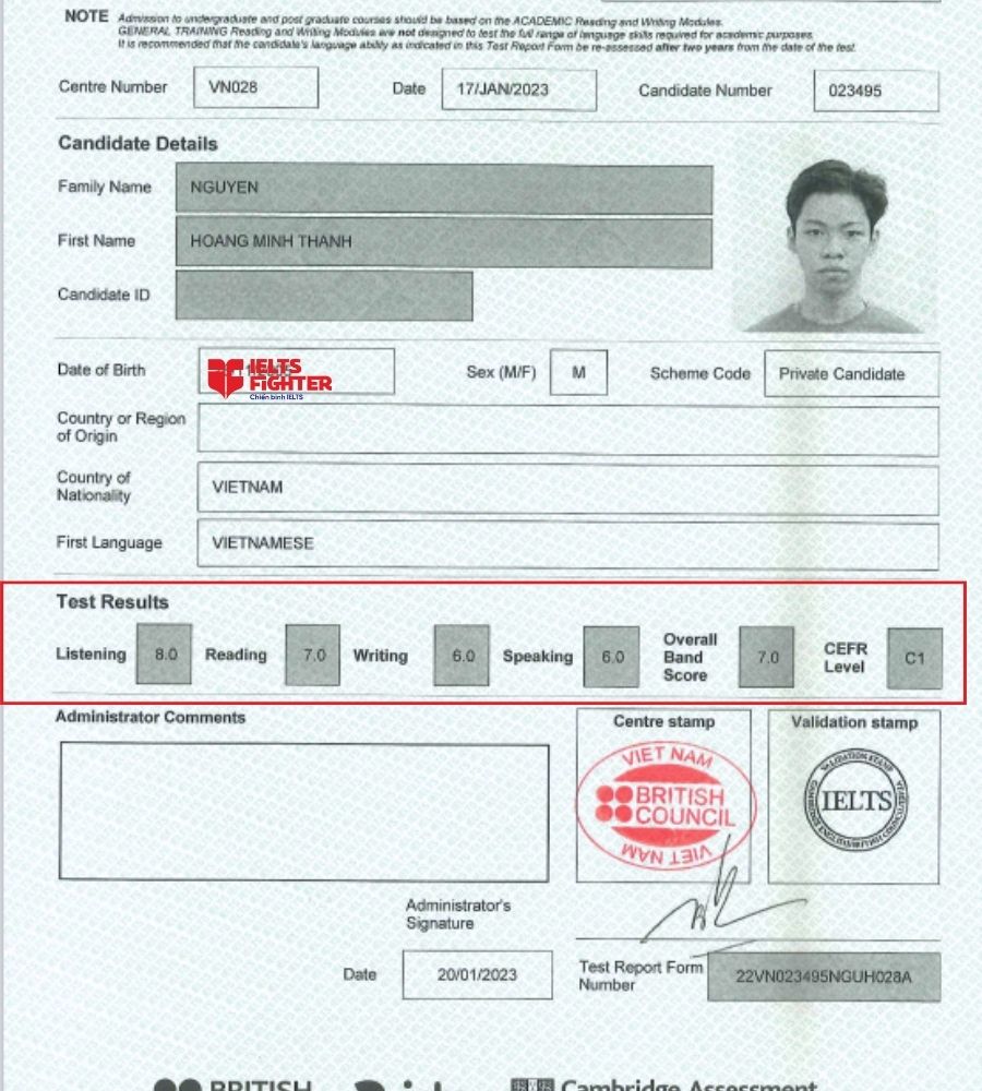 “Chào mọi người. Mình là Thanh, học viên lớp luyện đề 1-1 của thầy Hoàng Nguyễn ở IELTS Fighter 386 Nguyễn Thị Minh Khai, Quận 3. Mình khá là vui và bất ngờ khi đạt 7.0 overall sau 21 ngày (10 buổi chính + phụ đạo) tham gia khóa học 1-1 (trước đó mình chỉ đạt 6.0 khi test tại Summit).