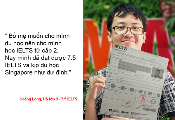 | Chị Thúy Vinh, mẹ em Hoàng Long, 14 tuổi, hiện đang du học Singapore cho biết: “ Mình xác định cho cháu đi du học nên tạo điều kiện tốt nhất cho cháu học tiếng Anh. Đến thời điểm cuối năm lớp 8, xác định hết cấp 2, cháu sẽ du học nên mình đăng ký lớp học IELTS để thi chứng chỉ này, đáp ứng tiêu chí du học.” |