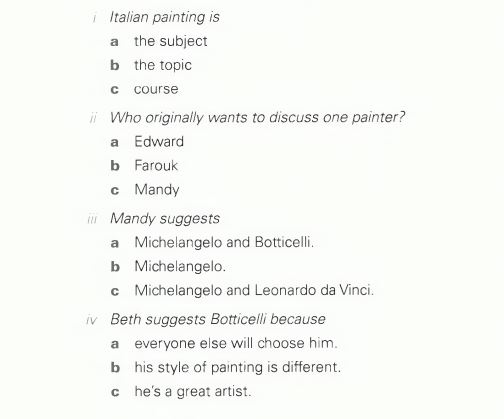 Beth: OK, everyone. The first thing we have to decide is our topic. I mean, what exactly are we going to talk about? We know the course is Art History and the subject is Italian painting , but that's still too big. We have to choose a particular topic. What do you think, Mandy?=> Italian painting được nhắc đến trong đoạn audio được xác nhận là subject