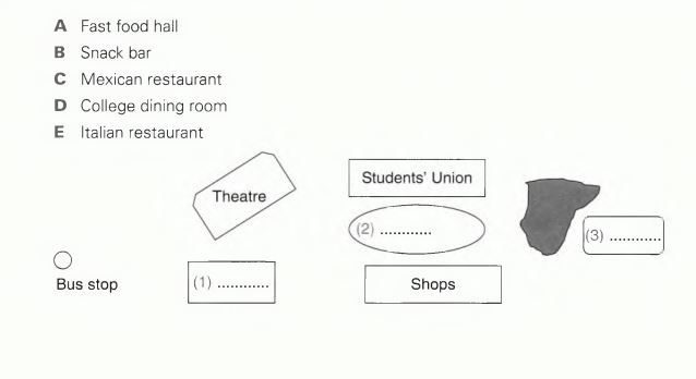 =>nhìn lên bản đồ, “college dining room” nằm ở giữa bến xe bus và cửa hàng, vậy chúng ta phải “label” nó vào vị trí thứ nhất.