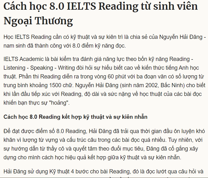 Bài chia sẻ chi tiết: https://vnexpress.net/cach-hoc-8-0-ielts-reading-tu-sinh-vien-ngoai-thuong-4352701.html