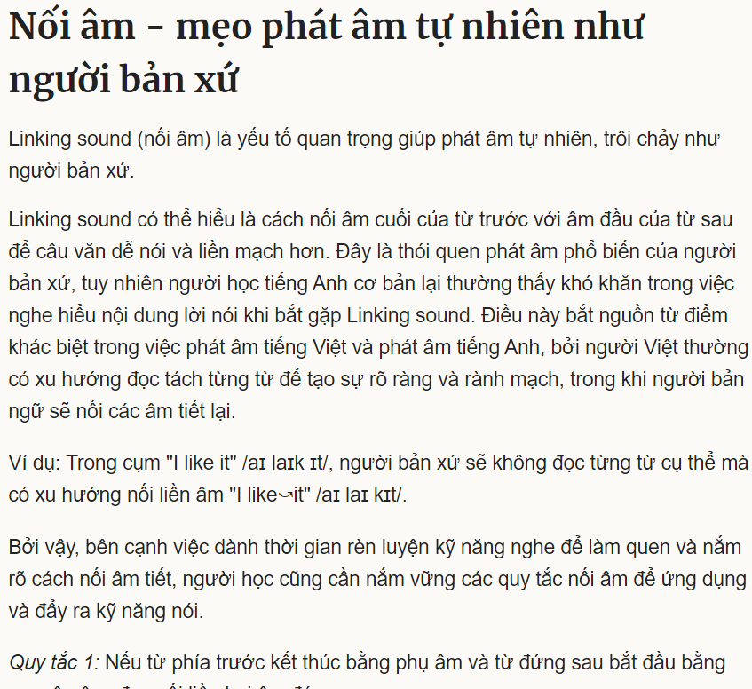 Nối âm (linking sound) có thể hiểu là cách nối âm cuối của từ trước với âm đầu của từ sau để liền mạch hơn, nhờ đó câu văn sẽ tự nhiên và trôi chảy hơn. Các quy tắc bạn cần nhớ khi luyện tập nối âm:
